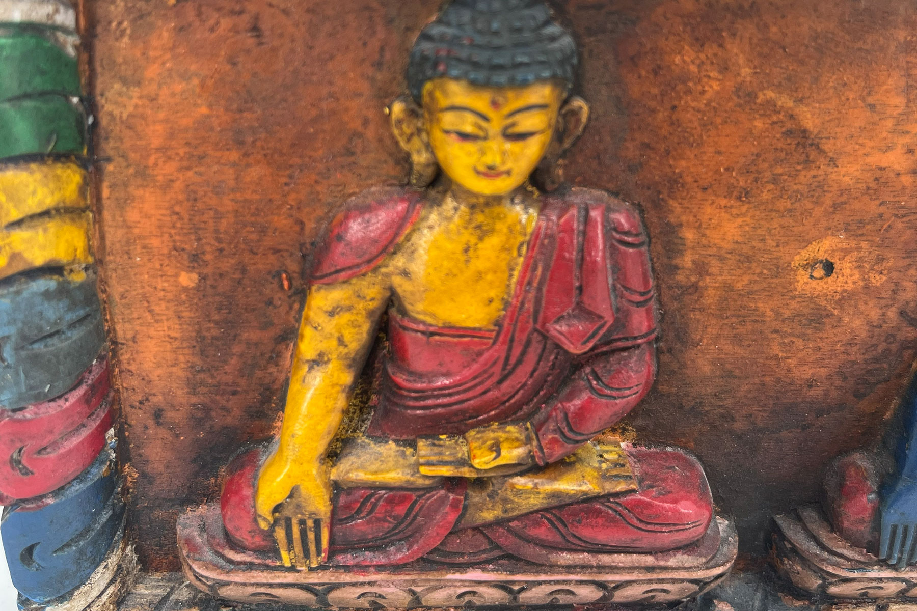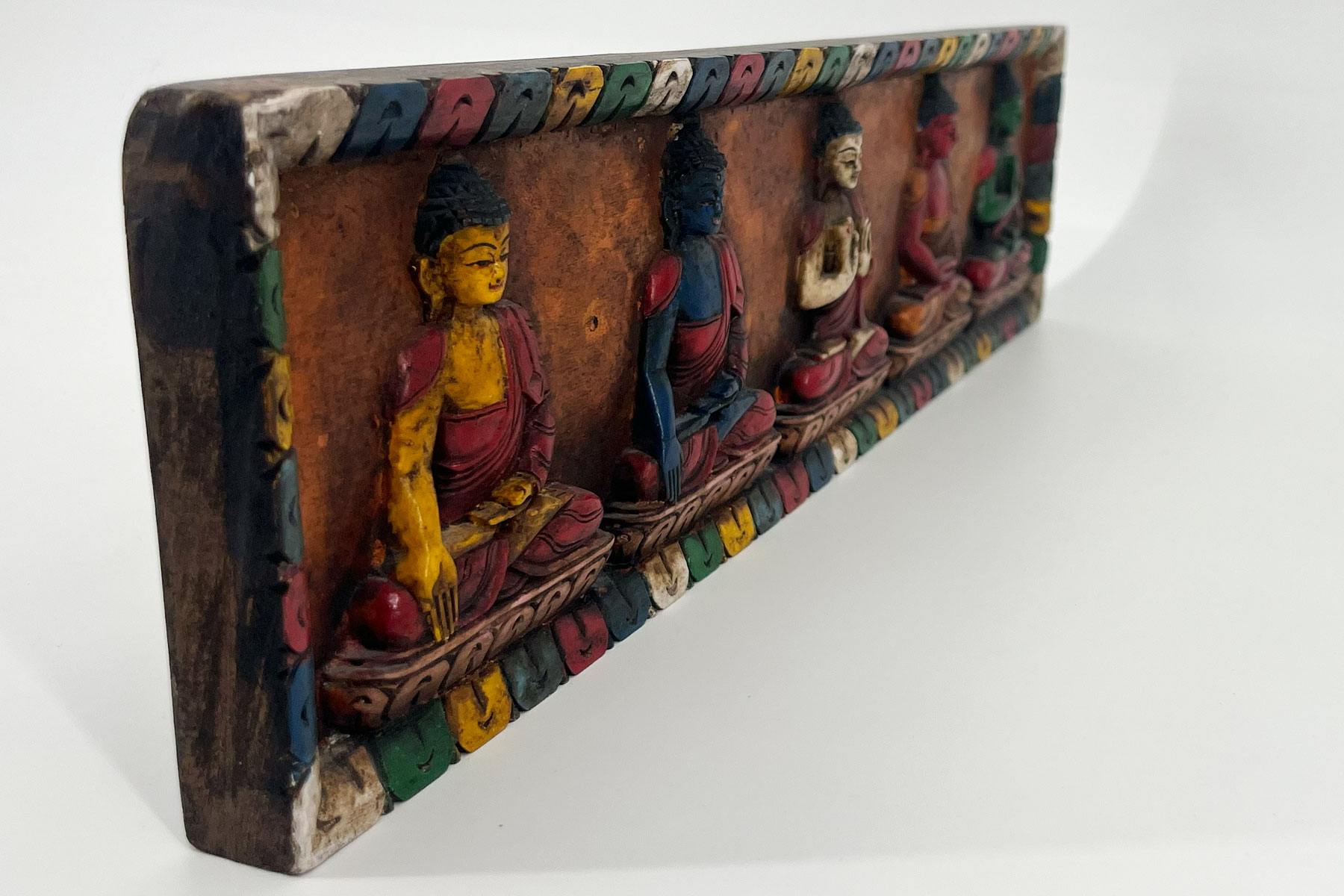 I am a wooden carving of the Five Buddha Wisdoms. Reality, mirror-like, equality, discerning, and leadership are the five wisdoms. Certainly, we bring meaning to any place you put us.