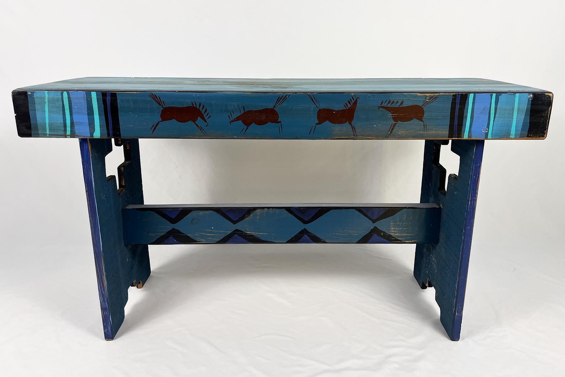 I am a one-of-a-kind hand painted bench. I am sturdy enough to sit on or I can be used as a table. Either way, I think my look is welcoming.